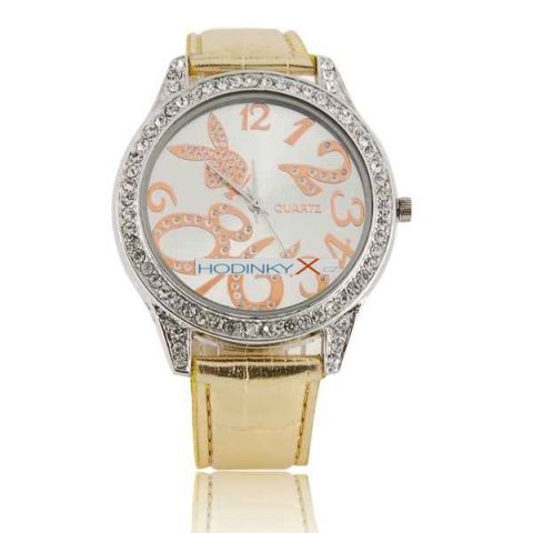 Ciferník osázen vkusně krystaly.